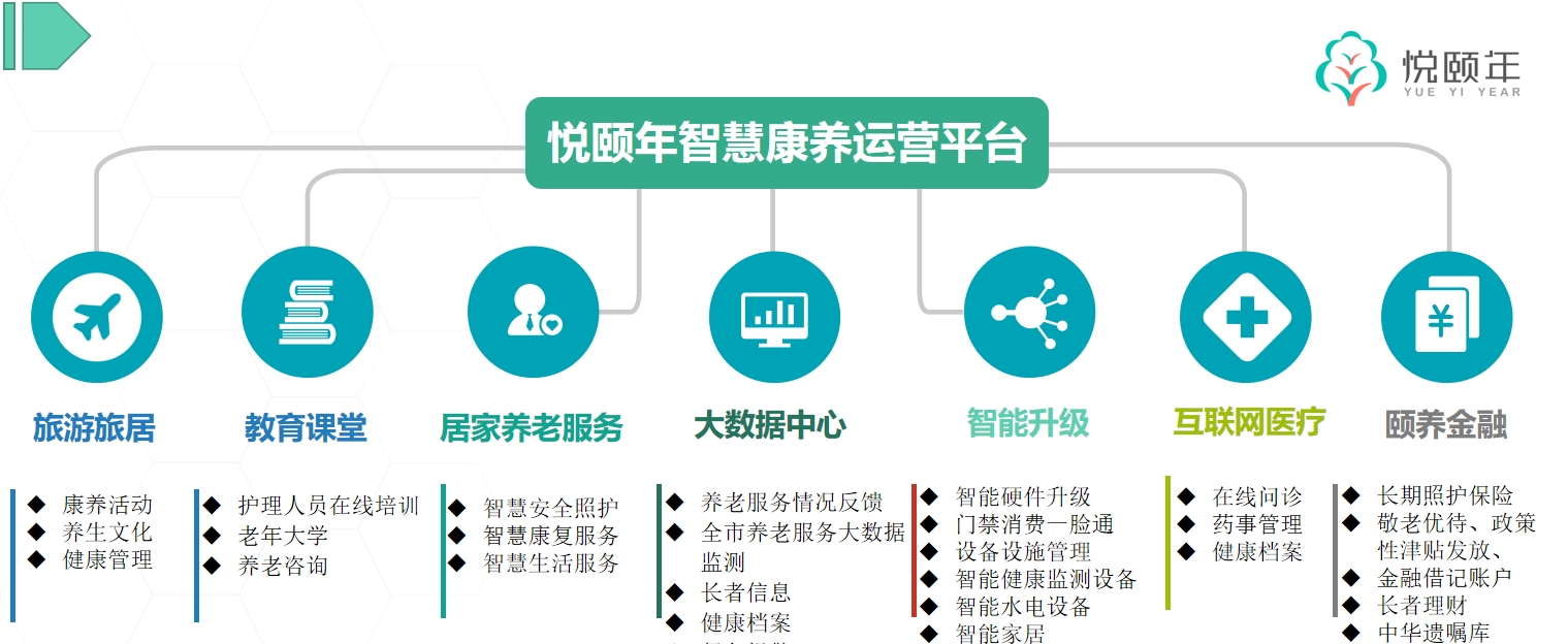 公司提供一站式智慧养老服务平台、智慧化大数据中心、深度医养结合的机构/社区居家运营管理系统;AIOT智能物联硬件设备,业务涉及机构养老、智慧社区/居家养老CCRC综合养老(养老地产),旅居养老等多种养老业态;涵盖老人能力评估、在线培训、旅游旅居、配餐购物、颐养金融等养老相关服务。